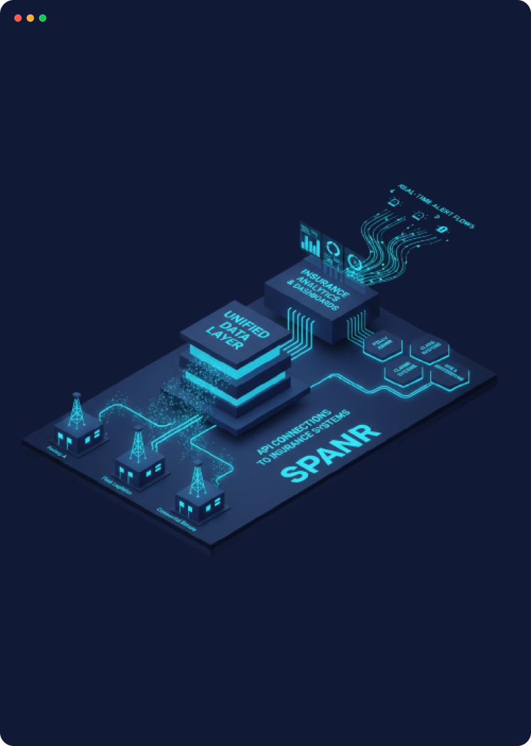 SPANR aggregates safety data from any OEM device, sensor, or system across all your insured clients into one normalized data layer. This unified intelligence feeds your underwriting models, claims systems, and risk dashboard, providing portfolio-wide visibility that fragmented, client-specific systems cannot provide.