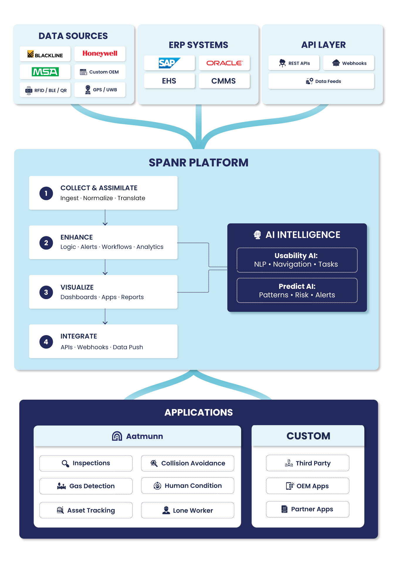 Raw data in isolation has limited value. SPANR ensures safety intelligence informs operational decisions across ERP, CMMS, HCM, and BI systems.